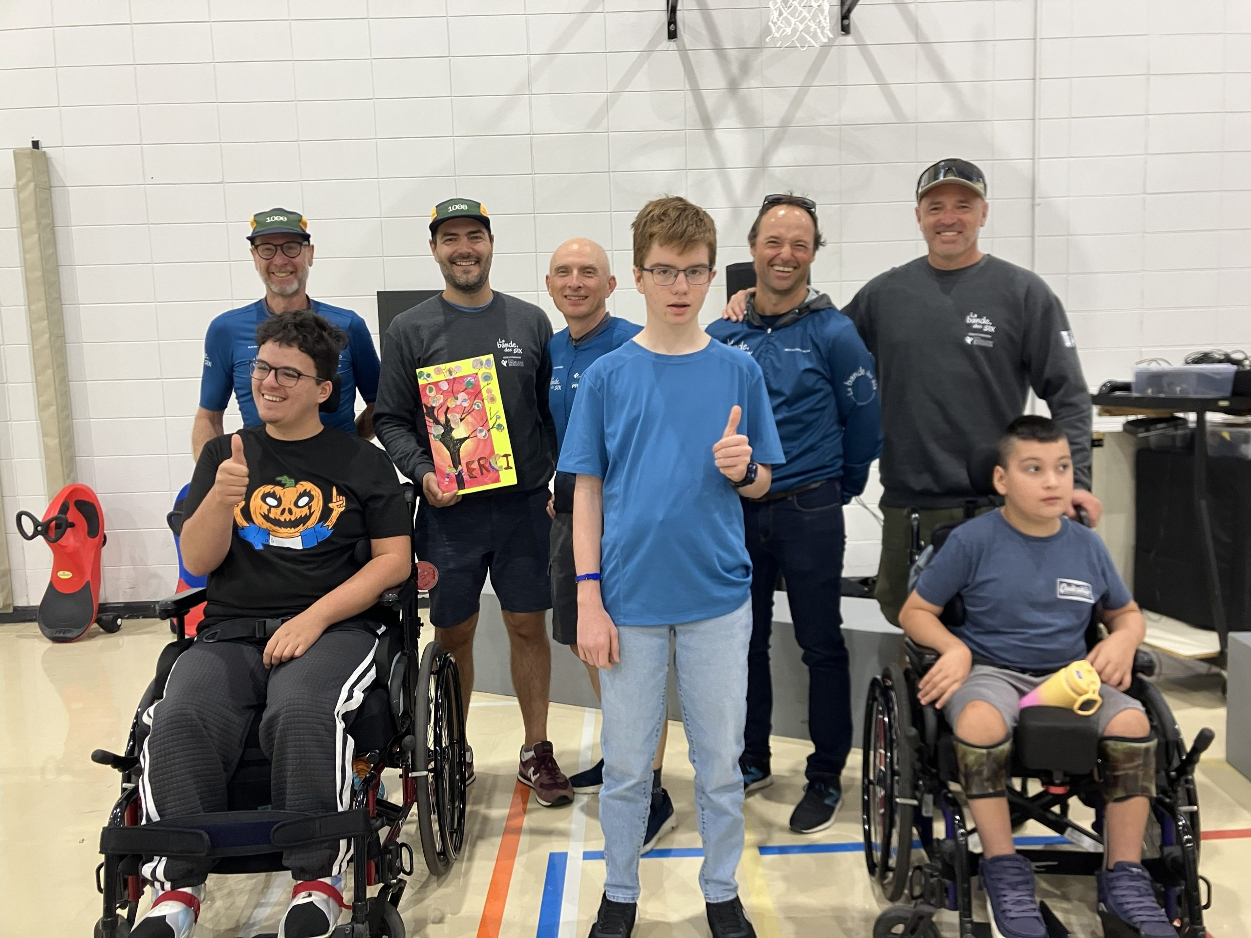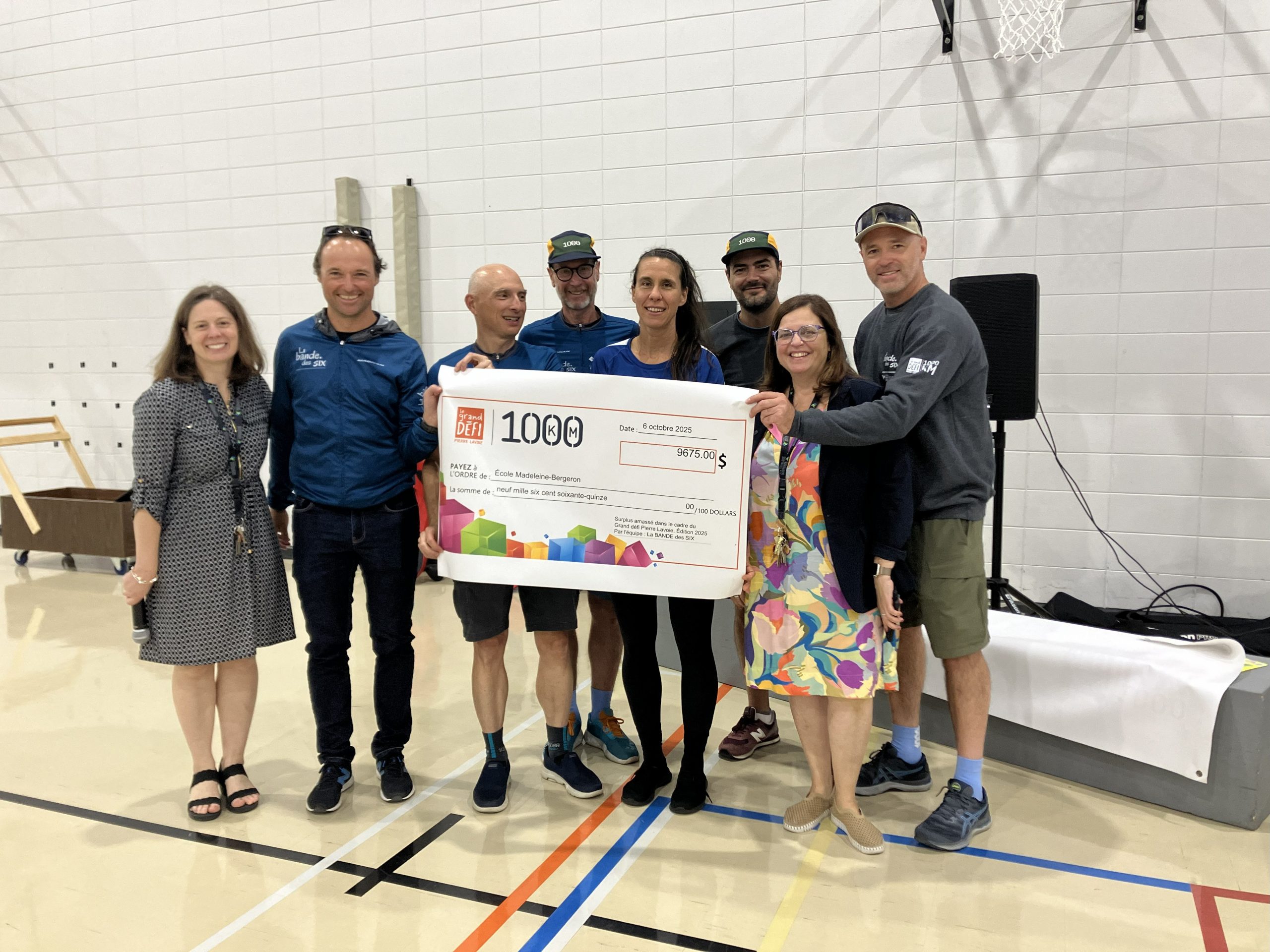 Lors d’une activité conviviale tenue au gymnase après la pause du matin, les membres de La Bande des Six nous ont remis officiellement le chèque. Ce moment a été marqué par un court montage vidéo préparé par notre collègue Véronique, ainsi qu’une magnifique carte de remerciements conçue par les élèves de Cynthia en arts.