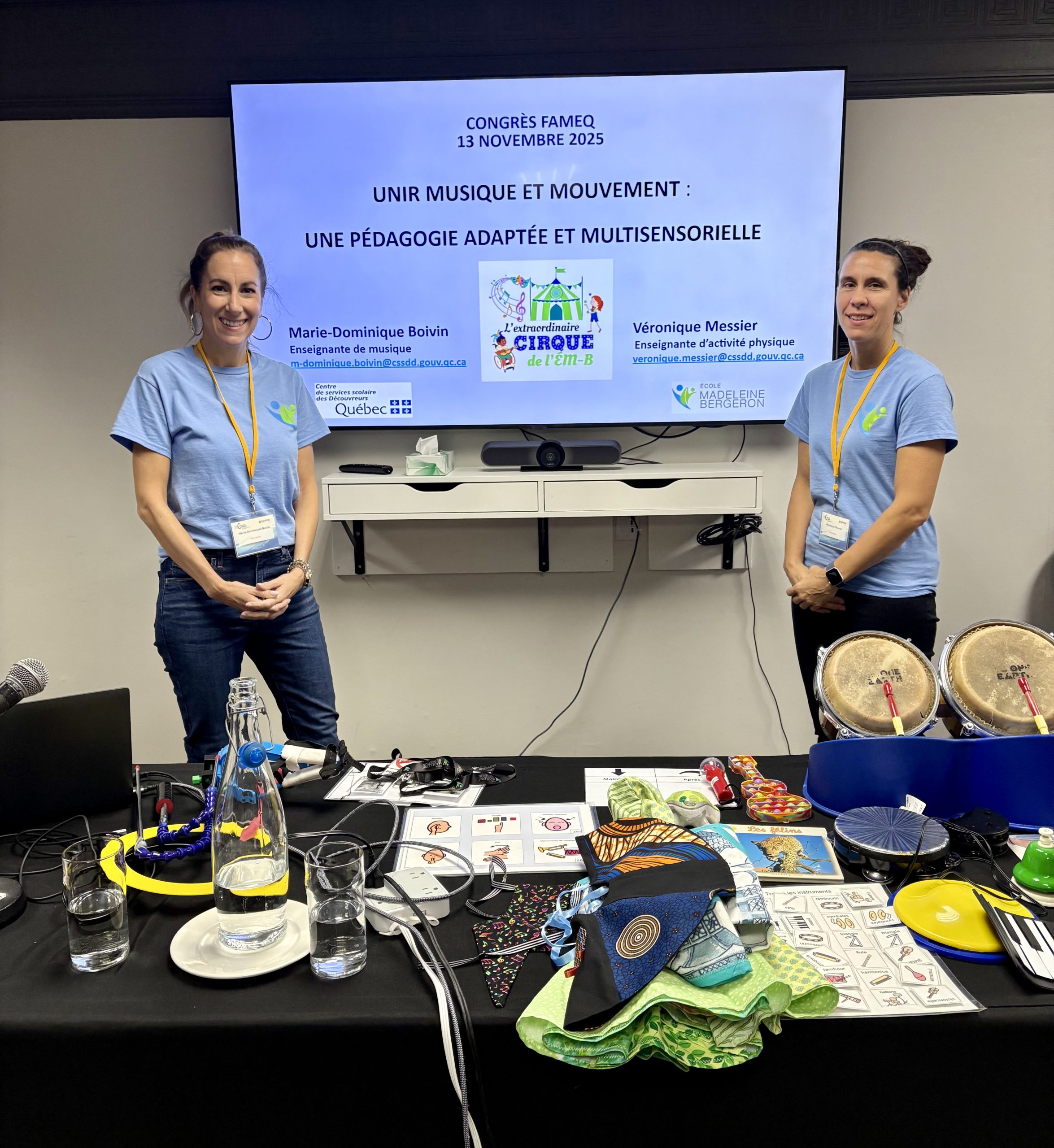 Lors du congrès de la Fédération des associations de musiciens éducateurs du Québec (FAMEQ), qui se tenait cette année à Rimouski du 13 au 15 novembre, Marie-Dominique Boivin, enseignante de musique et Véronique Messier, enseignante d’activité physique, toutes deux à l’école Madeleine-Bergeron ont offert une formation intitulée « Unir musique et mouvement : une pédagogique adaptée et multisensorielle ».